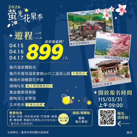 本次小旅行名額有限,超值優惠價每人只要899元,報名成功且完成報到者還可獲得活動限定「專屬紀念禮包」(螢花泉亞麻提袋+在地特色梅),歡迎民眾把握機會,與親友一同來場輕鬆愜意的春日小旅行,走訪楠西山林、賞花泡湯,享受春日悠閒與在地特色體驗。