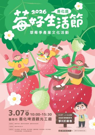 ◎活動時間:115年3月7日(六)10:00-15:30。◎活動地點:善化區觀光啤酒廠。※活動內容包含YOYO家族表演、特色市集、免費草莓啤酒品嘗、拍貼機體驗,以及闖關再拿限定禮等豐富內容,並自2月27日(五)起至善化區草莓園採果皆享8折優惠。